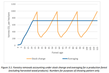 - Form a view that if averaging is not used going forwards, and land-use is, then despite likely detail and complexity on assumptions and point of accounting, each forestry system should include the inevitable end-of-life release of emissions such that forests will be net zero carbon.