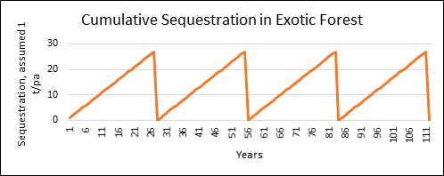 - The graph (across many exotic forest cycles) looks wrong because forests (and even the accounting of forests with harvested wood products excluded) approaches net zero carbon over time. When harvested wood products are included then the forests will get even closer to net zero carbon over time – so why is there net sequestration, particularly when there will not be much marginal land for new forest plantations after 2050?