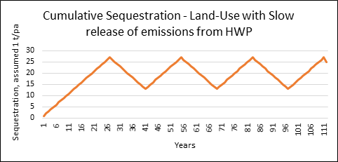 - The following graph shows what happens if harvested wood products take 14 years to release the carbon, during which time the forests are replanted (for simplicity and to illustrate the point, all emissions release is assumed to be harvested wood products):